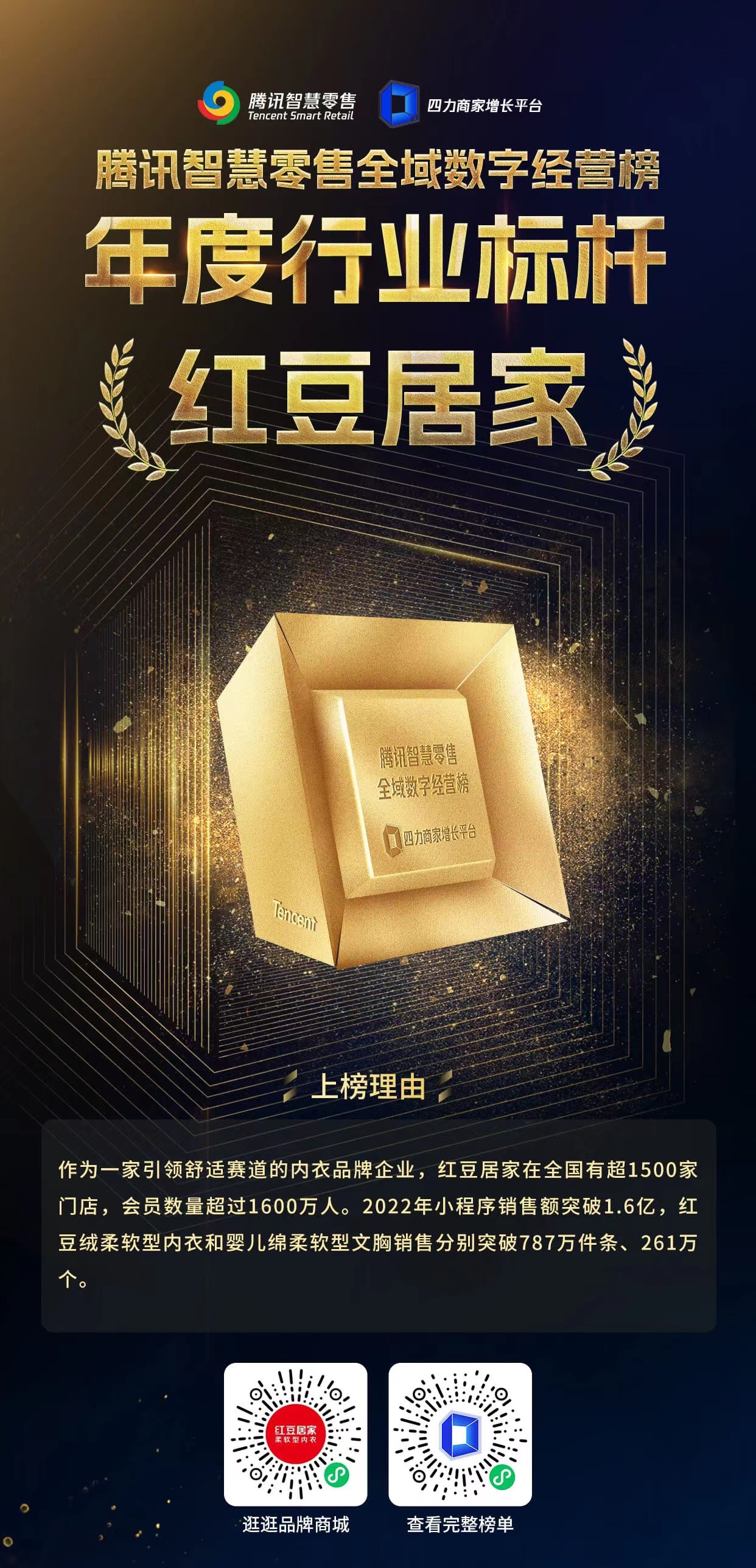 近日,由騰訊聯(lián)合《哈佛商業(yè)評(píng)論》中文版及多領(lǐng)域?qū)<遥笾腥A區(qū)艾菲等頭部機(jī)構(gòu)聯(lián)袂推薦,2022騰訊智慧零售全域數(shù)字經(jīng)營(yíng)榜發(fā)布。紅豆居家憑