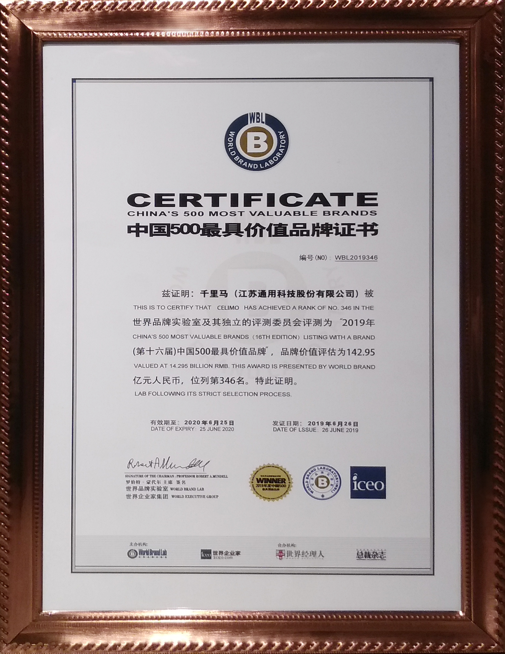 6月26日,由世界品牌實驗室主辦的第十六屆“世界品牌大會”在北京舉行,會上發布了2019年《中國500最具價值品牌》分析報告,其中通用股份旗下品牌——千里馬輪胎以142.95億元的品牌價值榮列本年度中國最具價值品牌榜346位。
