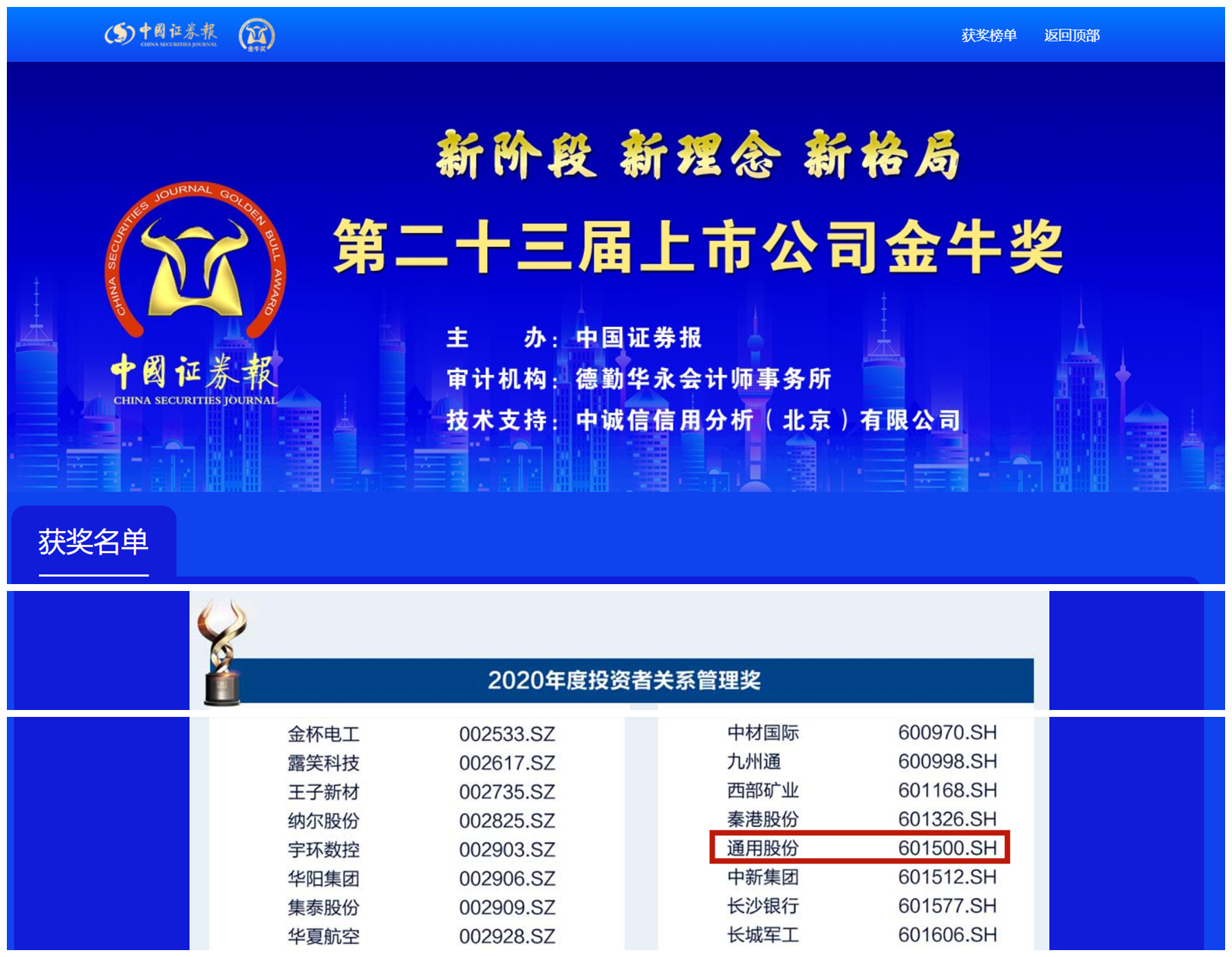 通用股份榮獲金牛獎"投資者關系管理獎"