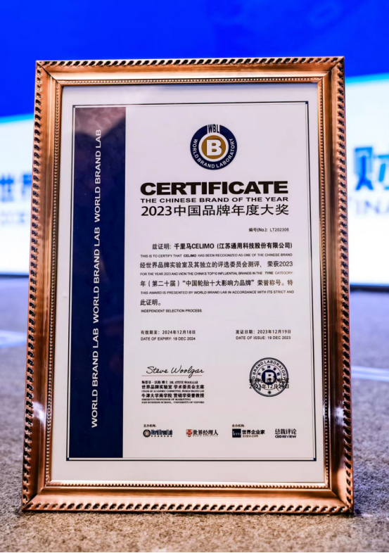 12月19日,2023年“中國品牌年度大獎”評選在“世界經理人峰會”上揭曉。通用股份憑借強大的品牌實力、卓越的創新能力以及優異的產品品質,再度榮獲2023“中國輪胎十大影響力品牌”。